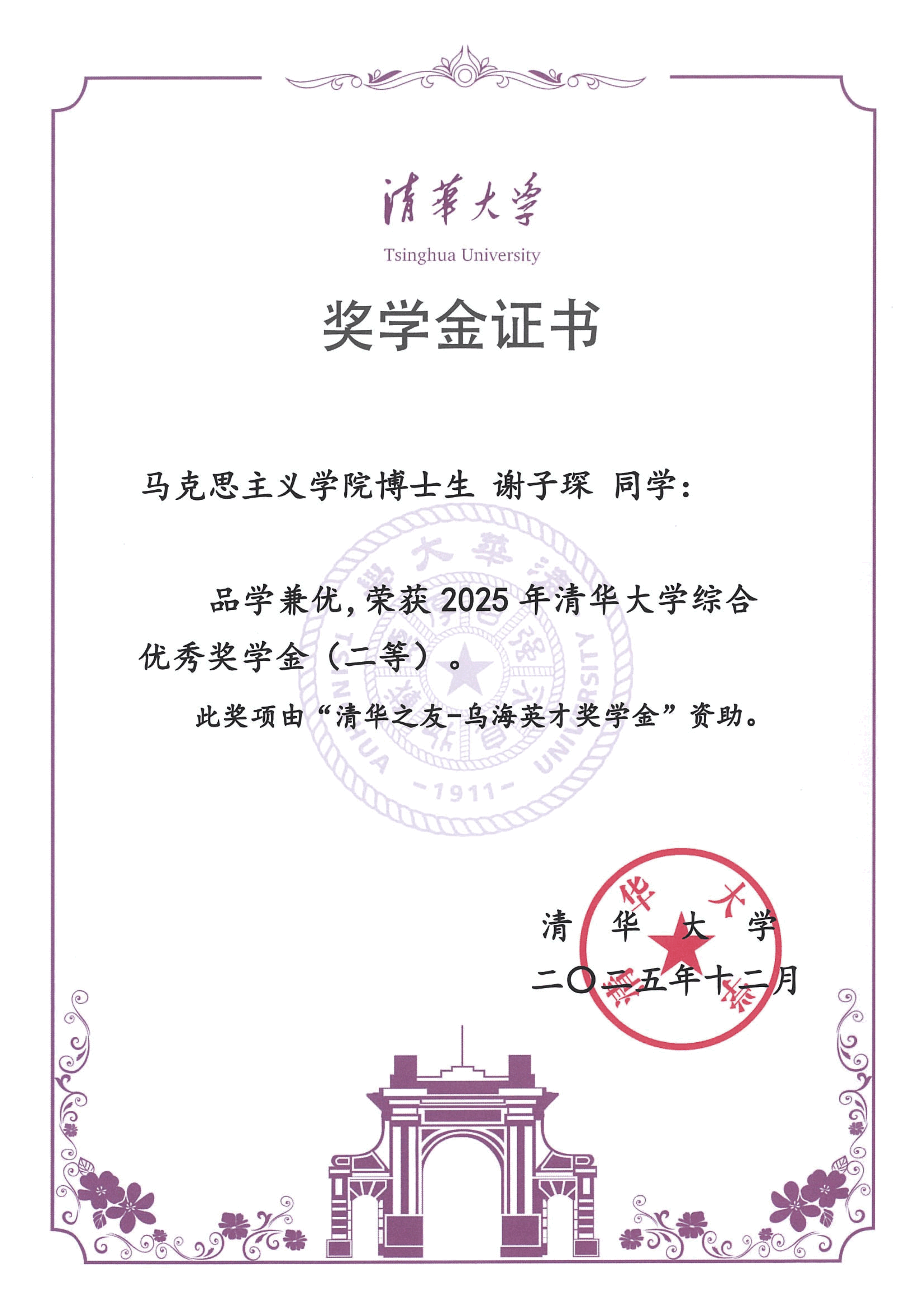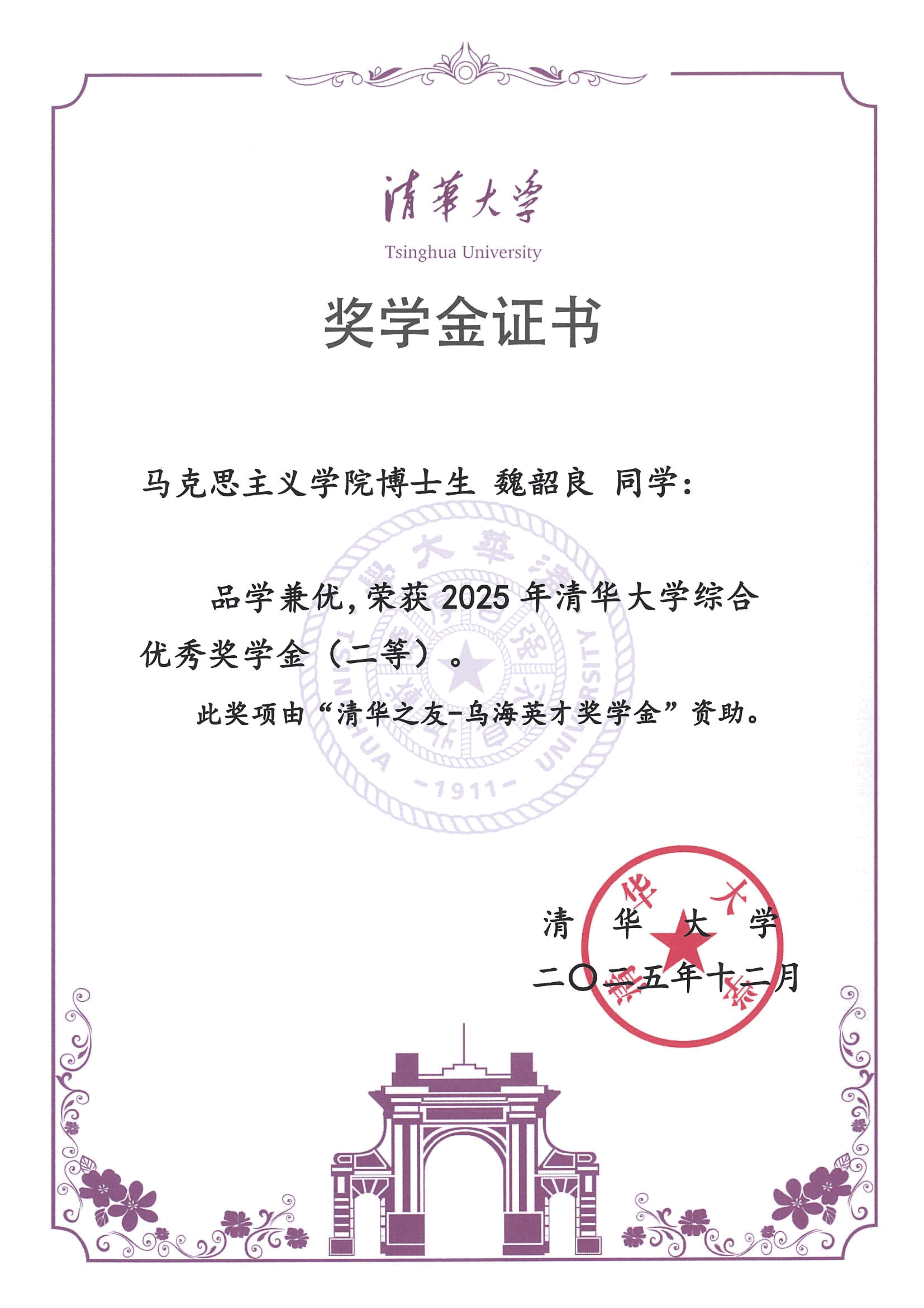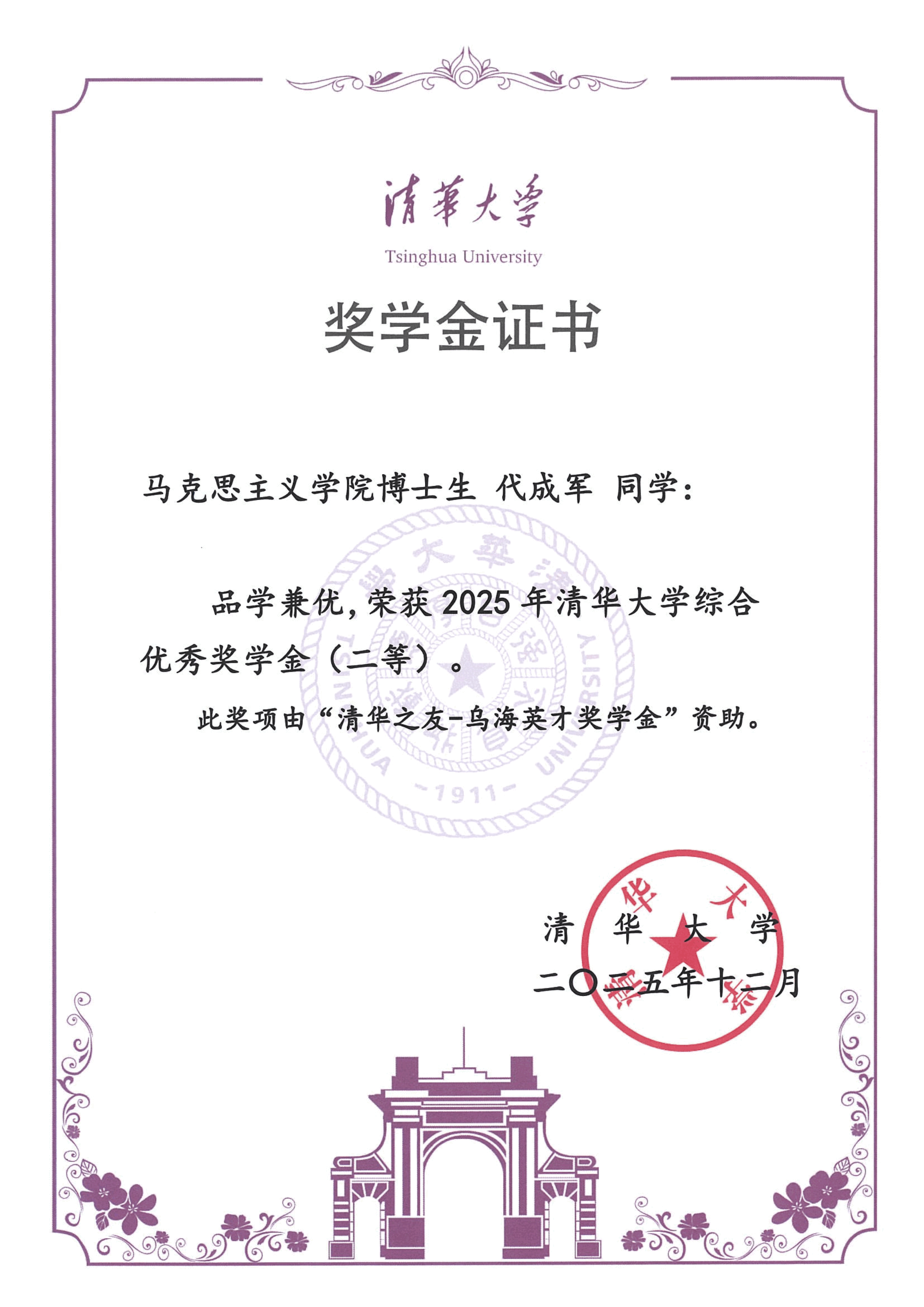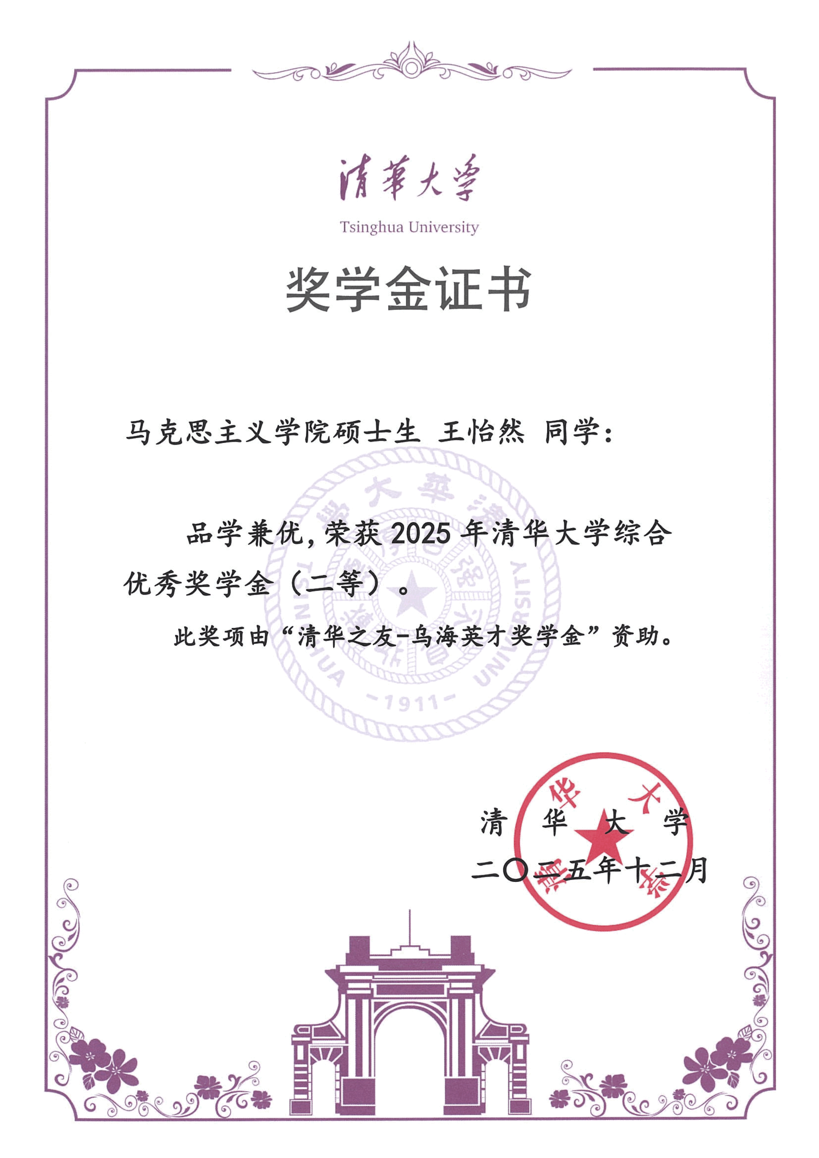 清华大学马克思主义学院2025年度综合奖学金获奖情况