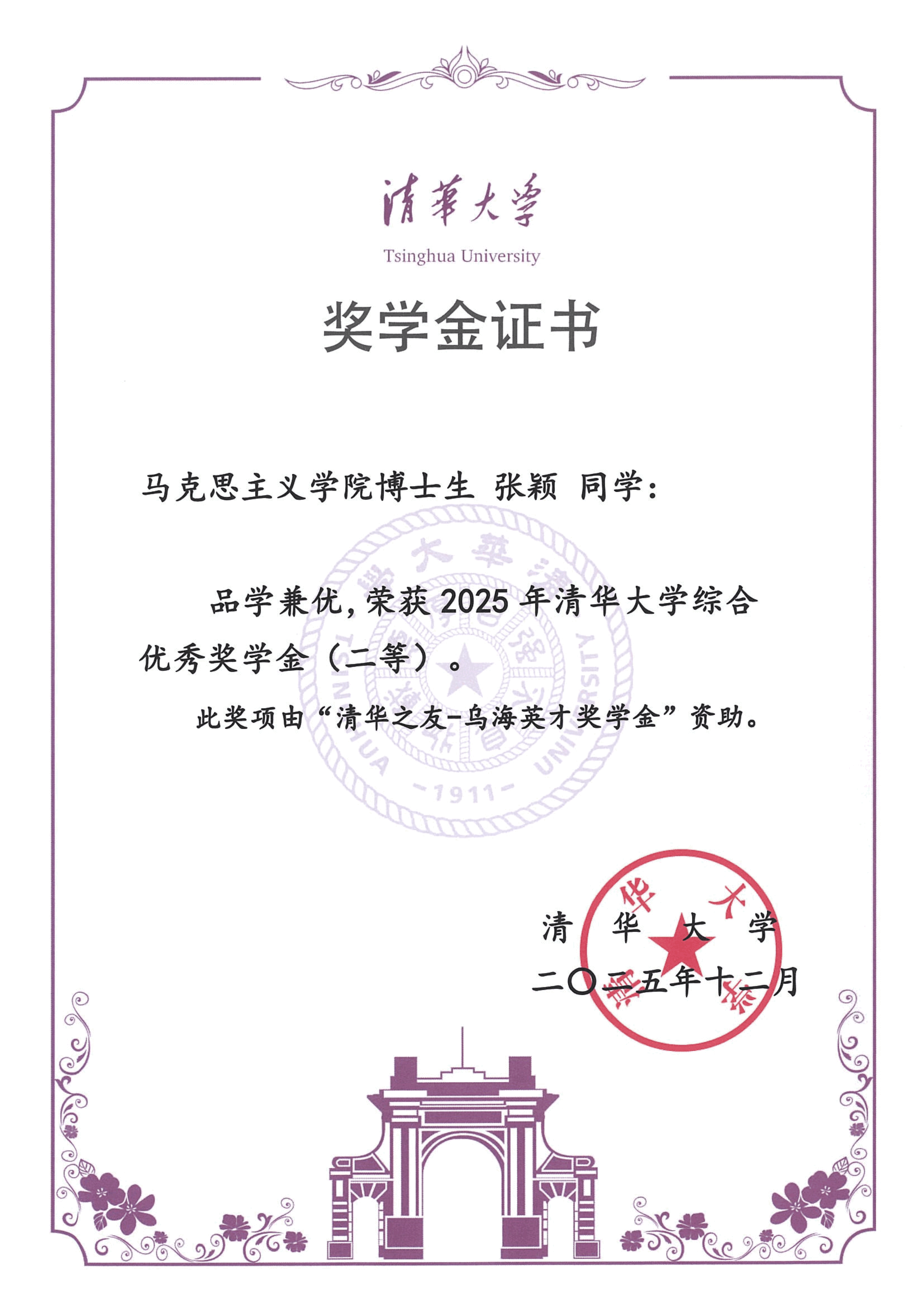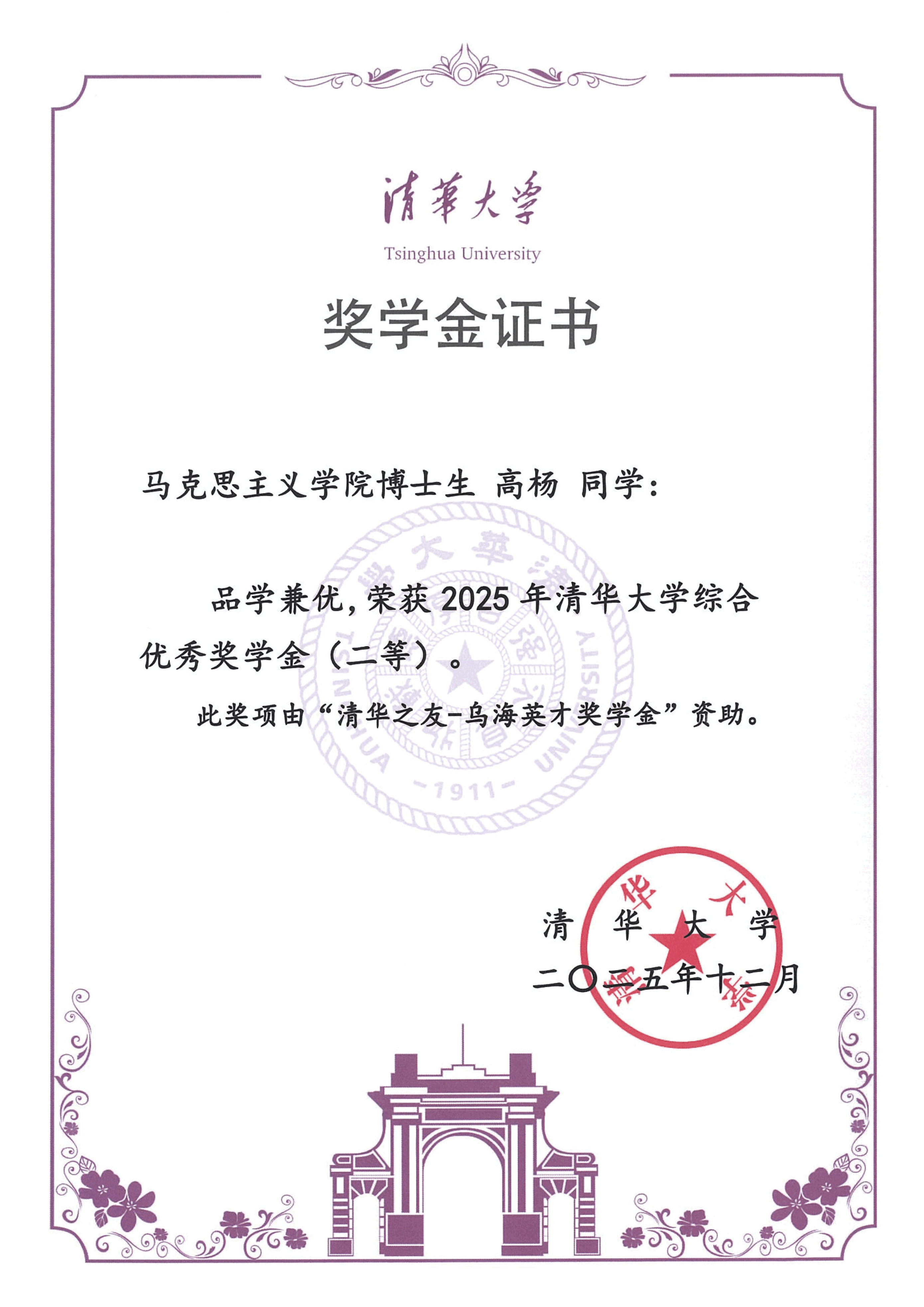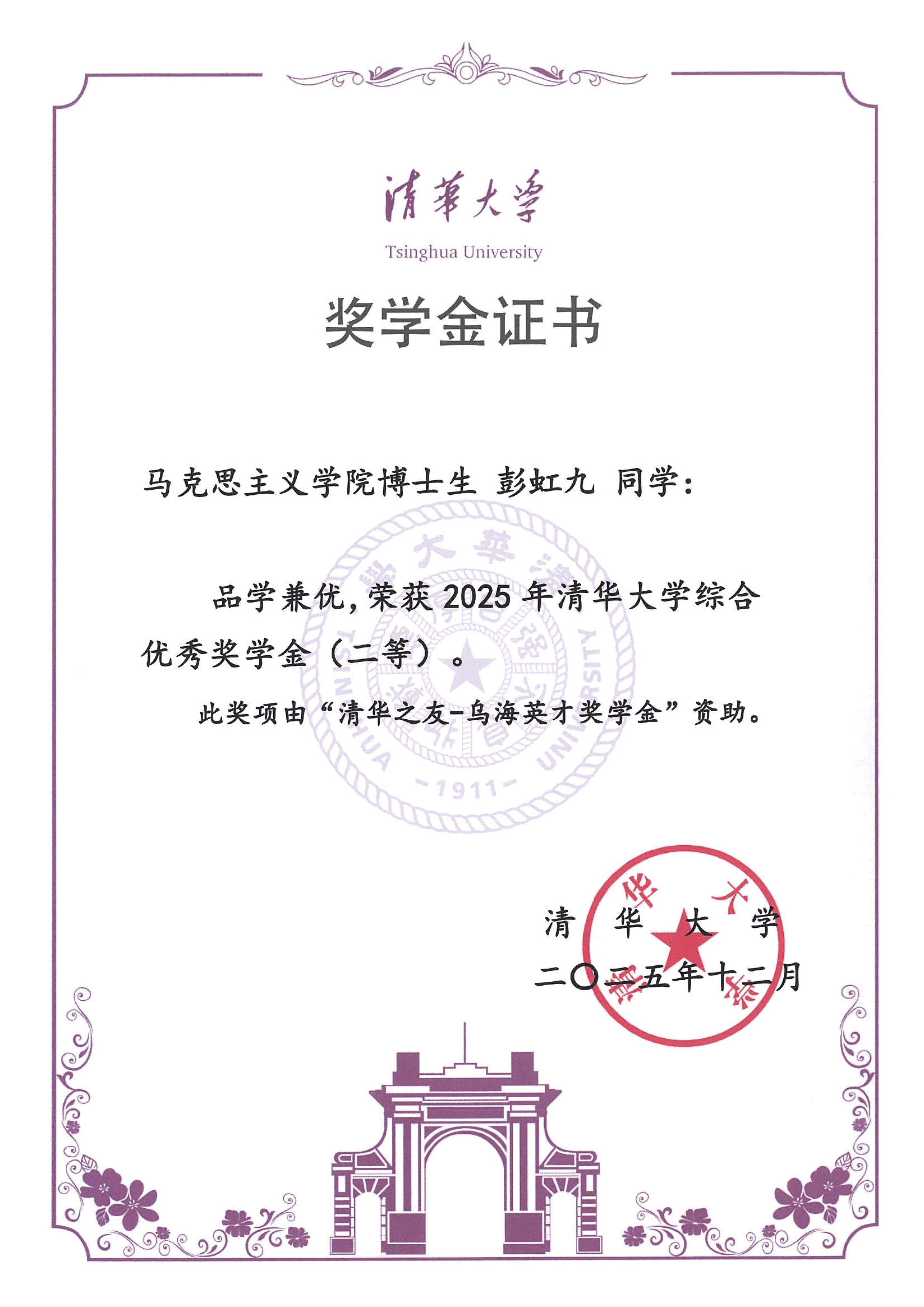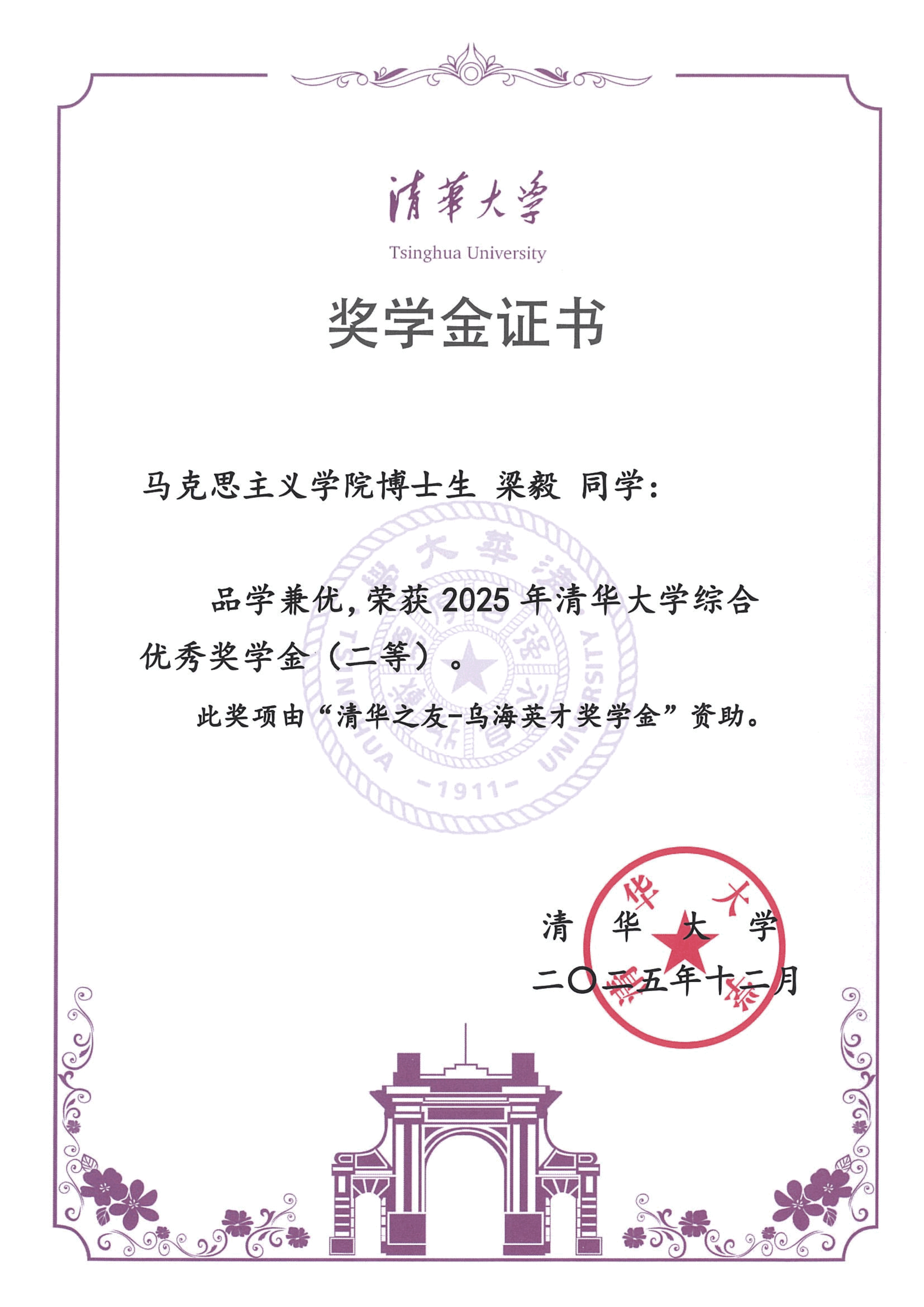 清华大学马克思主义学院2025年度综合奖学金获奖情况
